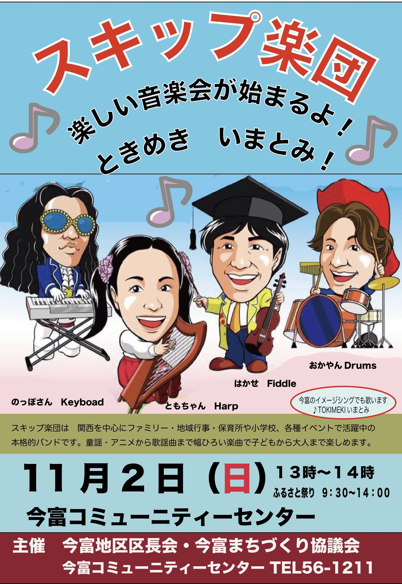 【今富コミュニティセンター ふるさと祭り】 11月2日(日) 13:00〜14:00 福井県小浜市 今富コミュニティセンター 地域団体や子どもたちの発表などの「ふるさと祭り」9:30〜13:00。 ゲストとして13:00〜14:00 スキップ楽団コンサートです。